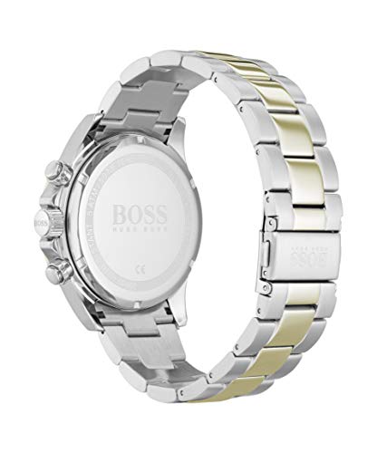 MATCHES ANY OUFIT, WHATEVER YOUR STYLE: They say you should never meet your heroes but this one certainly won’t disappoint you. Just like the man who wears it, this markedly masculine model confidently combines resolute ruggedness with sophisticated style. With its extensive selection of color and texture combinations, the BOSS Hero collection features a timepiece to match any outfit, whatever your style. QUALITY MATERIALS, EYE-CATCHING STYLE: Men's Hero, 45.07 mm two -tone stainless steel case and link bracelet, blue dial with printed index. QUARTZ CHRONOGRAPH MOVEMENT: Quartz watch movement is powered by a battery that charges and runs the watch. A Chronograph type of watch that is used as a stopwatch combined with a display watch. A basic chronograph has an independent sweep second hand; it can be started, stopped, and returned to zero by successive pressure on the stem. DURABLE MINERAL CRYSTAL: Made from glass and protects watch from scratches.